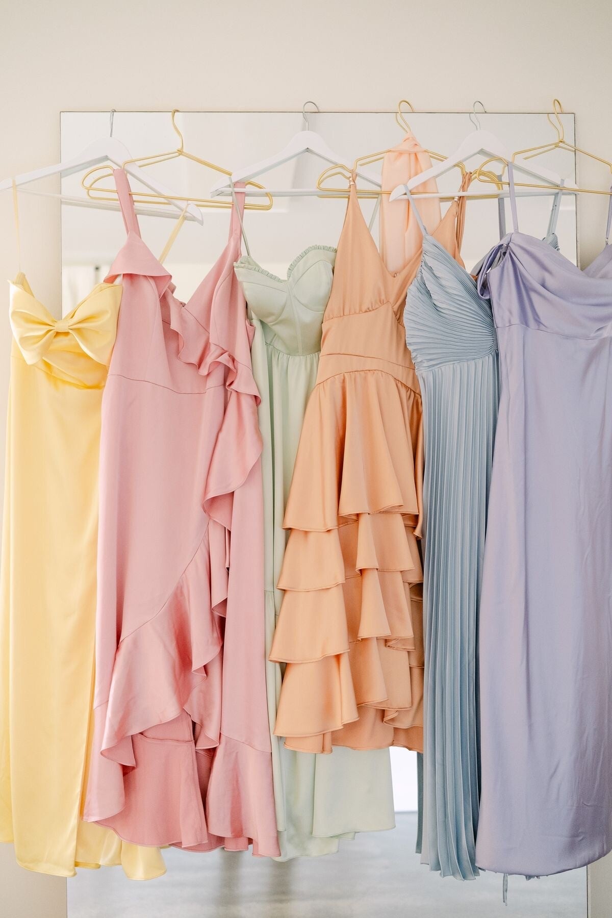 Kleuren & Details: zachte pasteltinten (roze, paars, blauw, groen, geel, oranje en beige). Denk aan lichte neutrale kleuren; zachte bloemenprints, ruches, strikken en een subtiele glans zijn welkom.